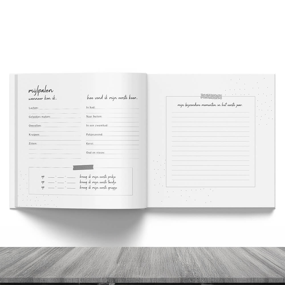 Het is niet moeilijk om dit babyboek te vullen,iedereen kan het– ook als je niet zo creatief bent! Aan de hand van toepasselijke vragen, de overzichtelijke fases enbelangrijke mijlpalenis het voor jezelf én de kleine leuk enwaardevolom het babyboek in te vullen. Zo krijg je een prachtig en compleet babyboek vol mooie mijlpalen enherinneringenvan het eerste jaar zodat alle waardevolle herinneringen nooit verloren gaan.