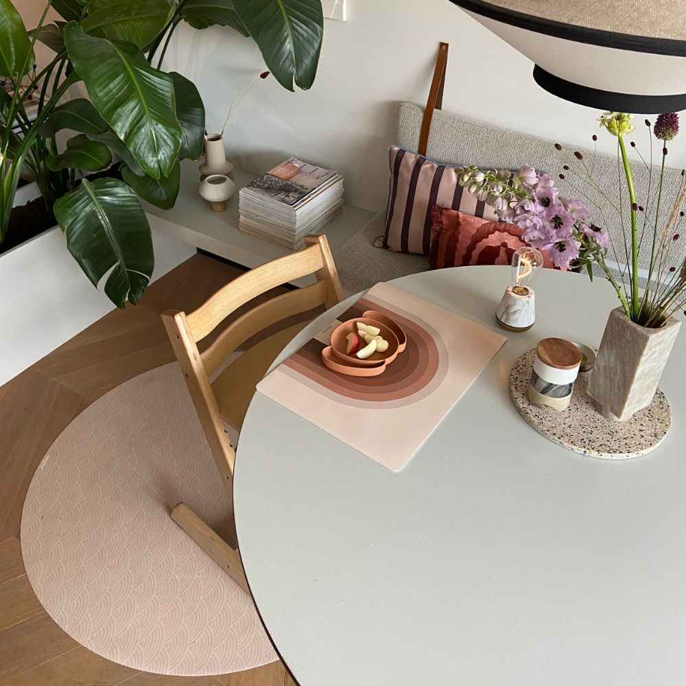 De Eeveve knoeimat Rainbow brengt een speelse en vrolijke sfeer naar eet- en speelmomenten. Het zachte regenboogdesign maakt van elke activiteit een feestje, terwijl de mat je vloer beschermt tegen knoeien.