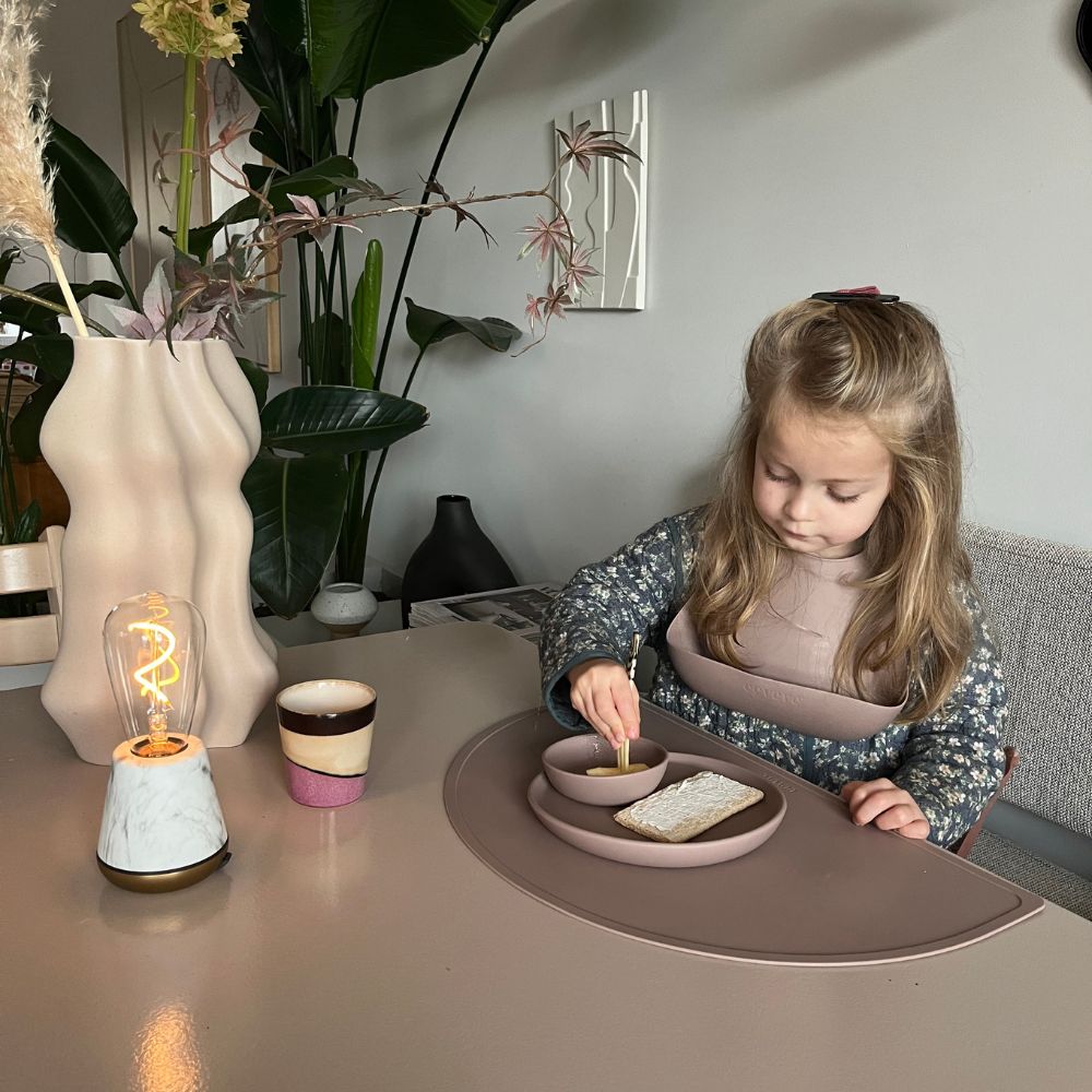 De slab is gemaakt van flexibel en duurzaam silicone dat zacht aanvoelt en prettig zit voor je kindje. Het waterafstotende materiaal is eenvoudig schoon te maken met een doekje of onder de kraan, ideaal voor dagelijks gebruik.